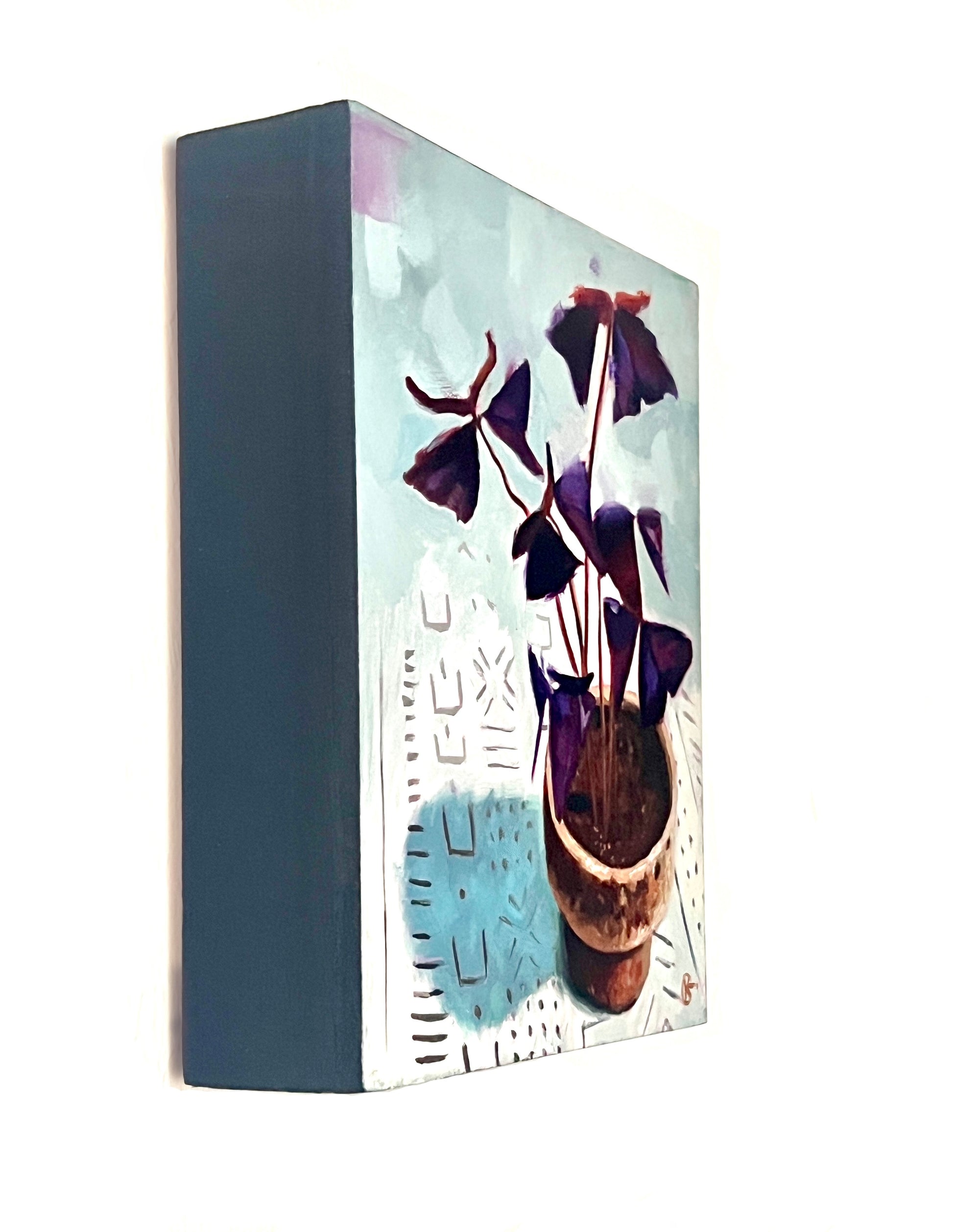 “Oxalis Triangularis” is a 7x8 inch oil painting that celebrates the delicate beauty of nature. Wrapped in 1¾ inch indigo blue wood sides, this unframed piece evokes tranquility and botanical elegance. Perfect for small spaces, prayer corners, or as a gift for plant lovers, this artwork brings a touch of creation’s quiet joy into your home.